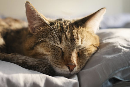 A sleepy cat dozing on a soft bed with its head on a pillow, capturing a tranquil and cozy moment.