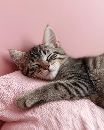 Cute little tabby kitten sleeping on pink pillow, top view
