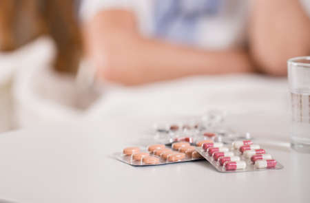 Difficult decision- dangerous pills on bed and young woman