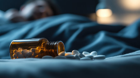 A close-up view of spilled pills beside a bed, highlighting themes of anxiety and sleeplessness. The blurred background adds a sense of unease and stress at night.