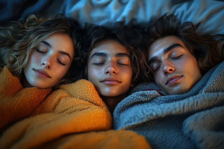 Three friends are peacefully sleeping side by side on a cozy bed wrapped in colorful blankets. Their expressions are calm and content.