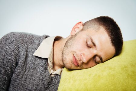 Young man sleeping in his bed in the evening at home. He is wearing a hoodie.