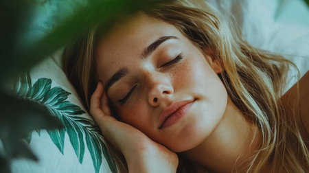 Captured in a serene moment, a young woman peacefully sleeps in a cozy bedroom filled with natural light, showcasing her beauty and tranquility.