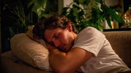 In a warm dimly lit room a young man rests comfortably on a couch his head on a pillow. Lush plants surround him creating a serene atmosphere at night.