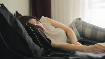 Young woman peacefully asleep on soft pillows in a cozy bedroom, with warm lighting creating a tranquil atmosphere