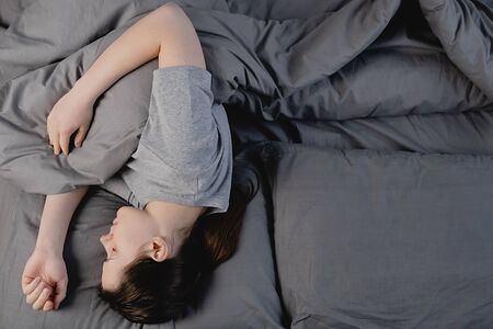 Top view of serene calm brunette woman sleeping in comfortable bed lying on soft pillow orthopedic mattress, peaceful young girl resting covered with blanket on grey sheets in bedroom.