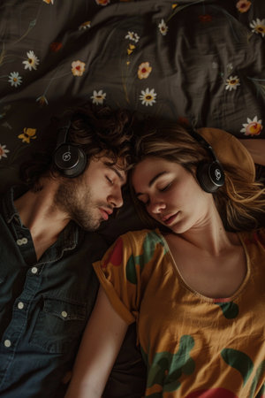 A man and a woman are laying on a bed with headphones on their ears. The man is wearing a black shirt and the woman is wearing a yellow shirt. Scene is romantic and intimate
