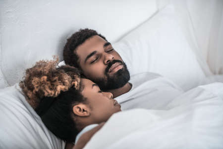 Sound sleep. Healthy lifestyle. Comfy softness of warm bed. Man sleeping peacefully. Calm and coziness.
