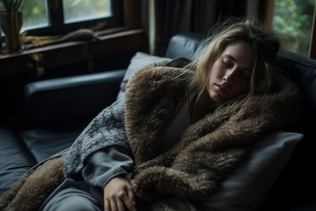 A man and woman are peacefully sleeping side by side on a couch, their eyes closed, conveying a sense of comfort and intimacy in a warm, inviting environment.