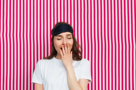 Sleepy young female with closed eyes touching face while drinking coffee early in morning against pink background