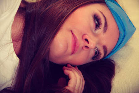 I feel so relaxed. Beautiful tired woman smiling while dreaming and wishing going to sleep