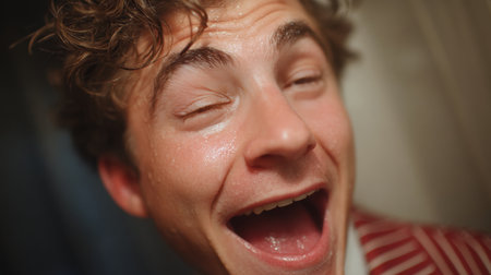 A smiling drunk person displaying a humorous and exaggerated expression in a playful moment