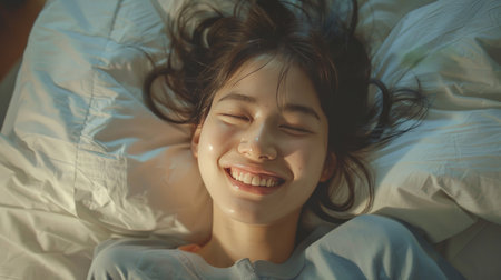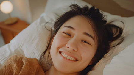 Close-up of happy Asian girl lying in bed on her pillow, smiling and rolling over as if feeling energetic in the morning, waking up early.