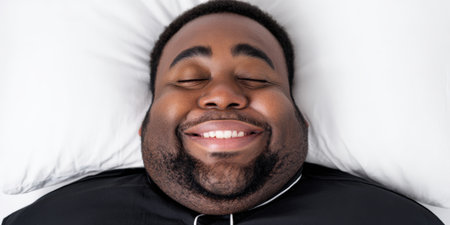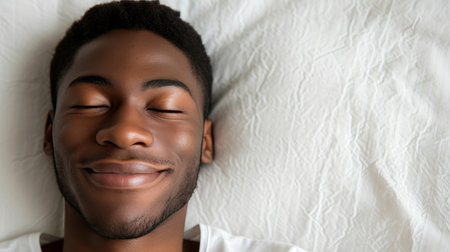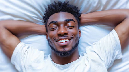 Black man lying on white pillow, eyes closed with a wide smile, peacefully sleeping and enjoying a joyful, restful dream, serene and relaxed in bed