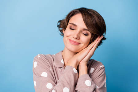 Photo of young beautiful attractive happy cheerful smiling dreamy girl sleeping isolated on blue color background