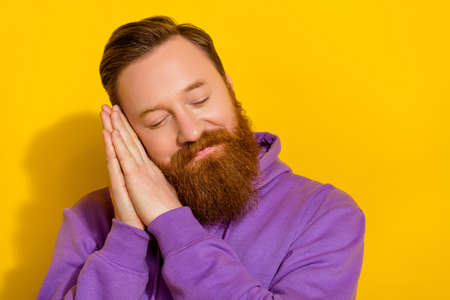 Photo of nice satisfied young person closed eyes head lay arms isolated on yellow color background