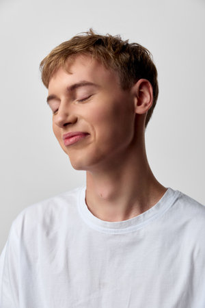 Relaxed, smiling male in a white casual tee in a studio setting with soft lighting, closed eyes, serene mood, minimal fashion vibe, clean background and focus on calm expression