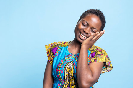 African american girl dressed in typical dazzling clothes chuckling in front of the camera, feeling comfortable and powerful. Pleased young woman laughing in studio over blue backdrop.