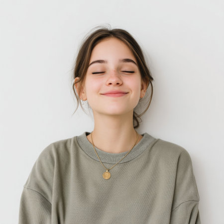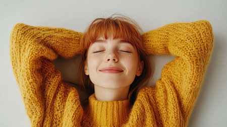 A serene young woman is captured smiling with her eyes closed, exuding warmth and joy in a cozy indoor space. She wears a casual sweater and simple jewelry, radiating tranquility.