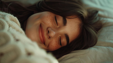 A young woman relaxes in a cozy bed, smiling gently as she sleeps. Soft sunlight streams through the window, illuminating her peaceful expression and warm sweater.