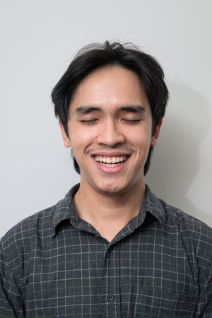 Portrait of a young man closing his eyes and smiling, conveying a sense of peace, serenity, and tranquility