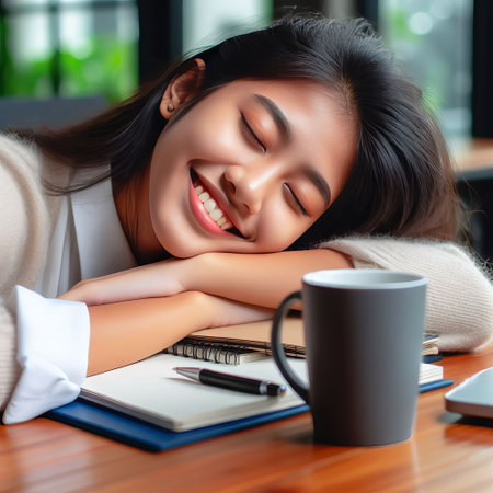 A young woman rests her head on her arms with a serene smile, a cup of coffee by her side suggests a moment of relaxation amidst studying. The ambiance is calm and inviting. AI generation