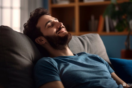 Asian man with beard relaxing on a couch, eyes closed and smiling widely, radiating genuine happiness, peaceful contentment and calm domestic wellbeing