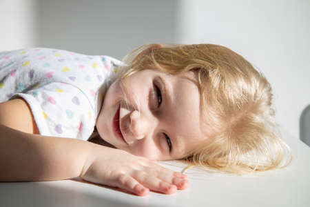 Umea, Norrland Sweden - March 17, 2021: cute little girl who closes her eyes in bright sunlight