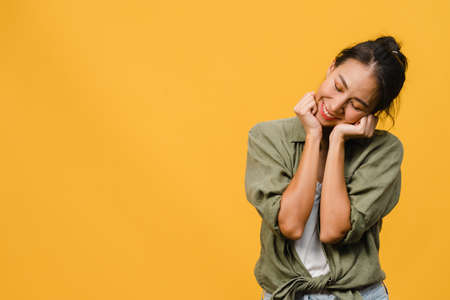 Portrait of young Asia lady with positive expression, smile broadly, dressed in casual clothing over yellow background. Happy adorable glad woman rejoices success. Facial expression concept.