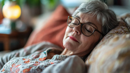 A woman is sleeping on a couch with a lamp behind her. She is wearing glasses and has a smile on her face