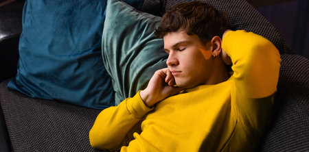 Young caucasian man sleeping peacefully on sofa at home, resting with eyes closed on soft pillow in calm comfortable living room environment. Autumn depression.