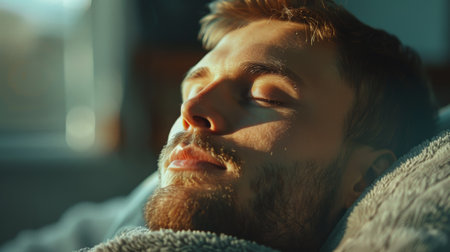 A young man relaxes in bed with closed eyes, radiating a sense of tranquility and peace. His curly hair and relaxed expression suggest a moment of pure comfort and rest.