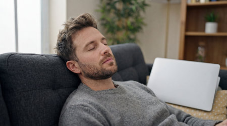 Relaxed young man napping on comfortable sofa at home with closed eyes and casual clothing in peaceful cozy living room setting.