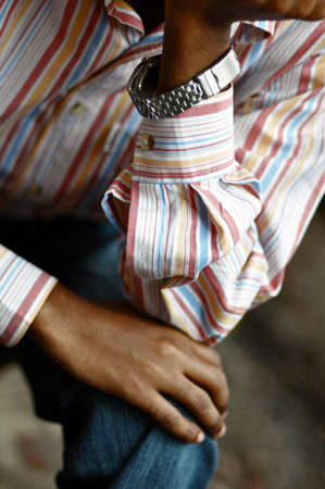 closeup of hands of man wearing striped shirt