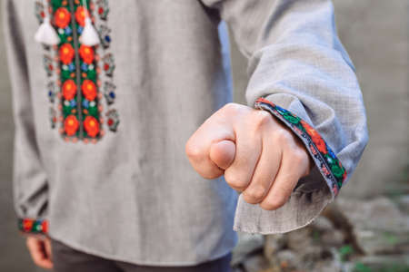 Hand showing the fig sign as a sign of disagreement and dispute. The man is wearing an embroidered shirt in traditional Ukrainian clothes. The answer to the occupiers during the invasion and war.