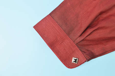 Sleeve of blue denim shirt. Clothes concept. Details of shirt on wooden background.