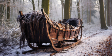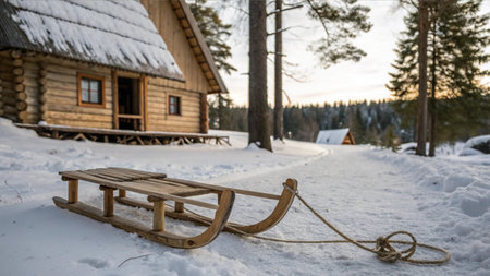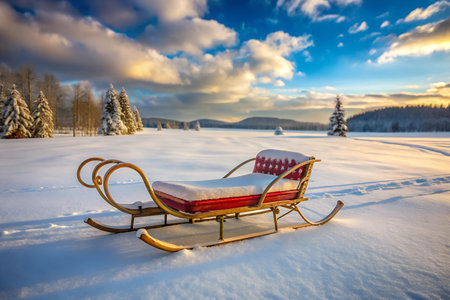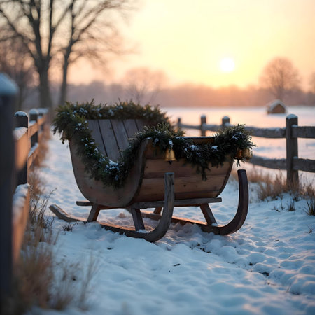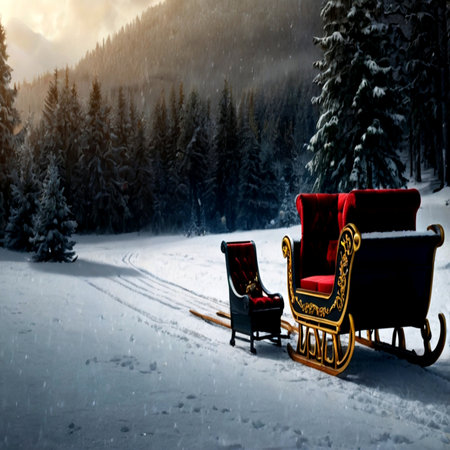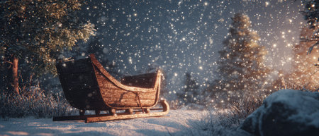 A rustic wooden sleigh sits empty in a snow-covered field, with a backdrop of towering trees. The scene evokes a sense of winter tranquility and the anticipation of a magical holiday season.