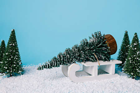Christmas scene with pine tree forest, snow and sleigh carrying cutted tree on blue background. Creative Xmas or New Year festive concept. Winter holiday landscape greeting card with copy space.