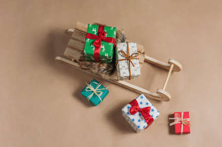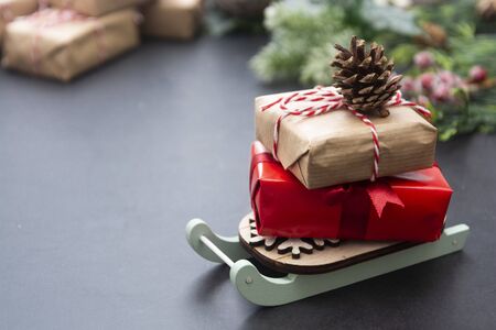 Christmas background or greeting cards, mock up with gift boxes on sleigh over gray background. Winter holiday