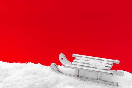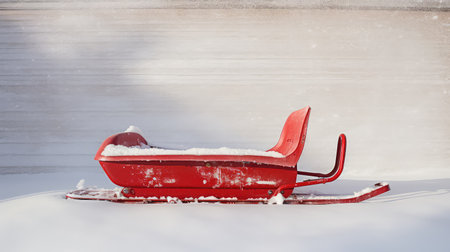 Beautiful red sled resting in soft snow with sparkling winter sunlight and blurred evergreen trees in the background