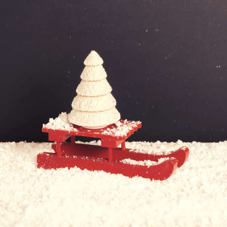 red festive sled with spruce tree in snow on chalkboard background, Christmas or New Year celebrating symbols, close up
