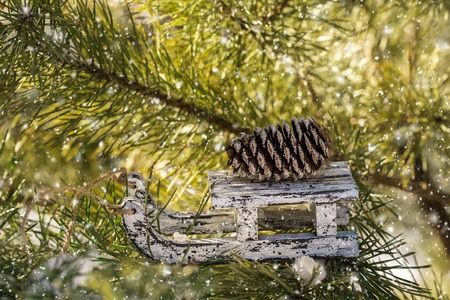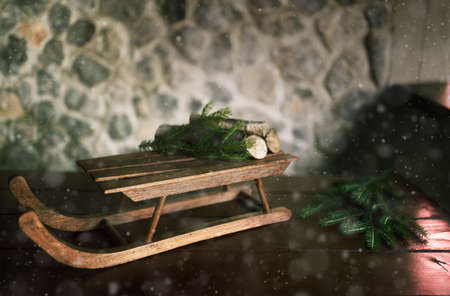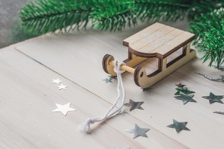 Christmas wooden toy sled on winter pine tree. winter still life. Winter holiday composition. selective focus, copy space