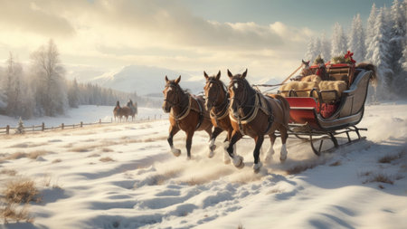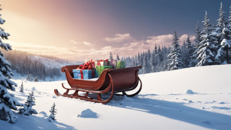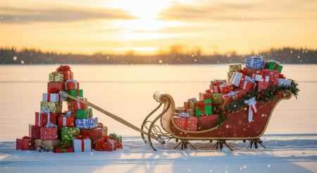 A magical sleigh overflows with Christmas gifts in a snowy landscape at sunset. This festive, peaceful scene is ideal for holiday cards, seasonal ads, and winter promotions.