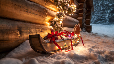 A decorative sleigh filled with Christmas gifts, adorned with ribbons and lights, sits in the snow by a log cabin.