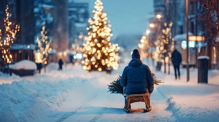 Person riding a wooden sled and pulling a small Christmas tree through a snowy city street during evening, with festive lights decorating trees and creating bokeh