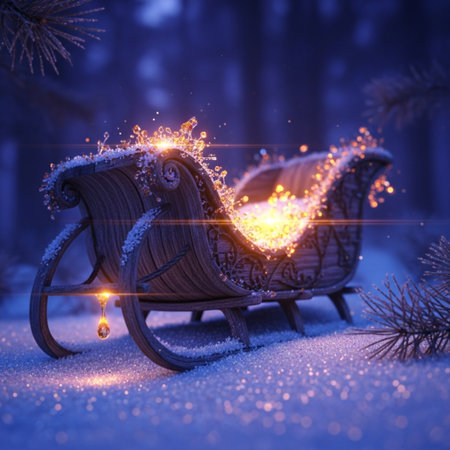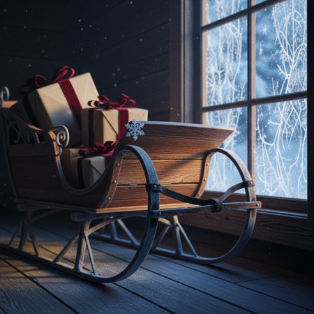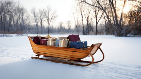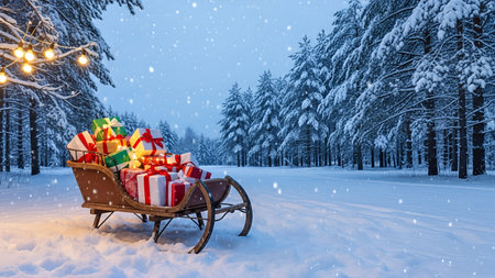 A vintage wooden sleigh filled with wrapped gifts, surrounded by snow and evergreen trees, with a warm golden light shining down
