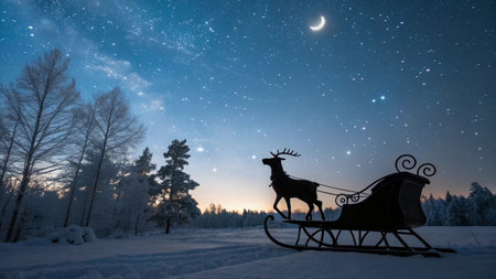 Silhouette of a reindeer on a sleigh against the background of the starry sky
