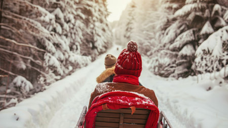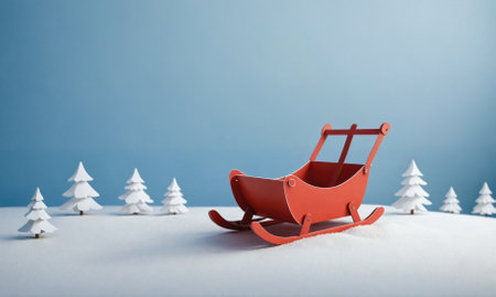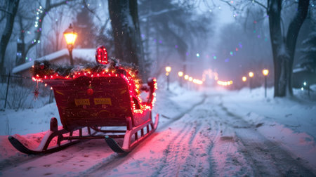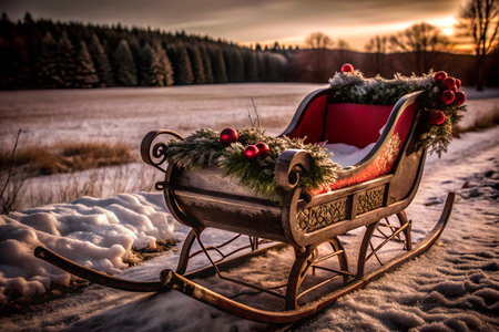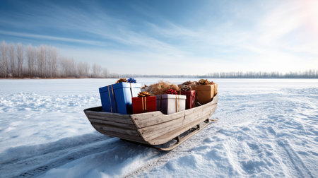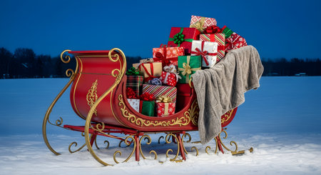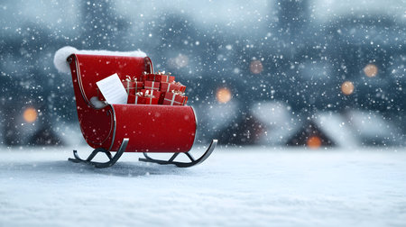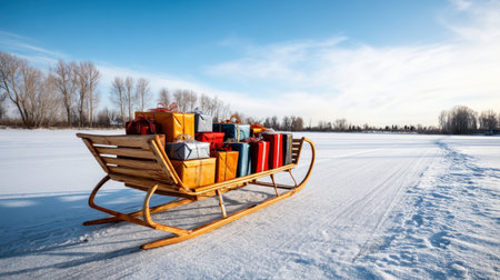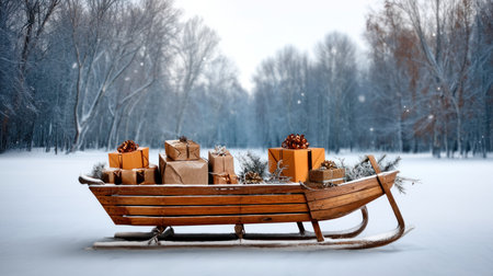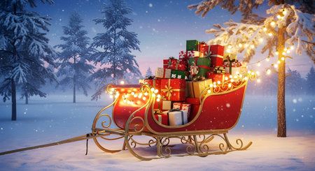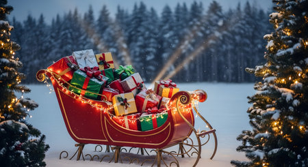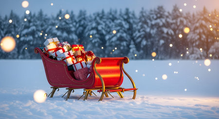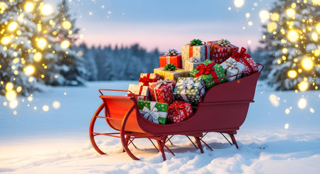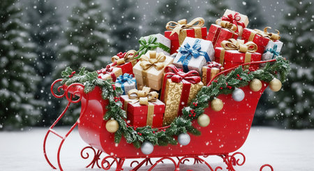 A red sleigh filled with Christmas gifts sits in a snowy winter landscape. Decorated with festive garlands, it embodies the spirit of giving. Ideal for holiday advertising or greeting cards.