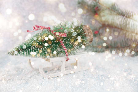 Small Christmas tree on wooden sled or sleigh, New Year snowy background, Xmas concept