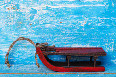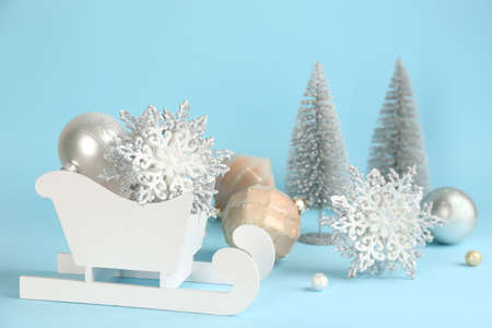 Beautiful Christmas composition with miniature sleigh on light blue background